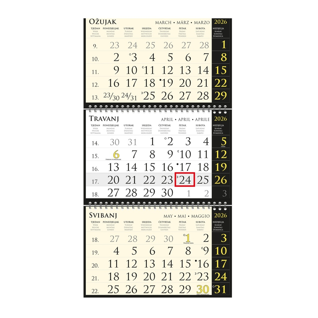 opseg: 12 listova x 3ndimenzija: 25 x 65 cm (cijeli kalendar)nprostor za dotisak: 25 x 17 cmnopis: tromjesečni kalendarij, pokazna traka, vrećicanjezici: HR, GB, DE, ITnvrsta papira: 80 g/m2 listovi, 290 g/m2 podloga, spec. papir sirio s teksturom nuvez: dvostruka spirala x 2 ( bez uvezane glave )npakiranje: 50 kom