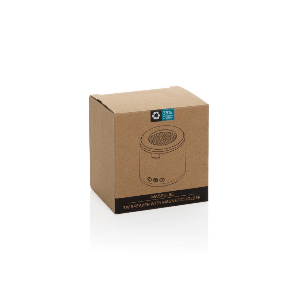The Magpulse RCS Recycled Plastic 3W Speaker combines clear sound with practical functionality in a compact, stylish design. Equipped with a magnetic holder, it doubles as a convenient phone stand, making it perfect for hands-free calls or streaming your favorite content. The 3W speaker delivers rich audio with an integrated subwoofer, and BT 5.4 ensures seamless auto pairing with devices up to 10 metres away. With a 400mAh rechargeable battery, the speaker provides up to 3 hours of playtime at 50% volume and recharges in just 1.5 hours via the included USB-C cable. The case is made from RCS certified recycled ABS plastic. RCS (Recycled Claim Standard) is a standard to verify the recycled content of a product throughout the whole supply chain. Total recycled content: 35 % based on total item weight. This speaker is PVC-free and packaged in an FSC-certified kraft box. Its lightweight, portable design and magnetic functionality make it an excellent companion for work, travel, or leisure.