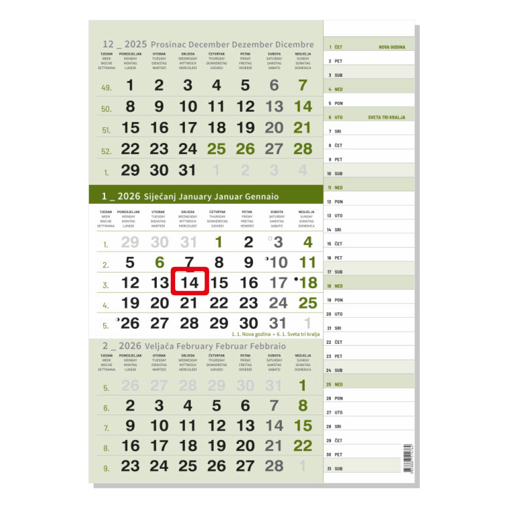 opseg: 12 listovandimenzija: 29,5 x 62 cm nprostor za dotisak: 29,5 x 20 cm nopis: tromjesečni kalendarij, npokazivač, vrećica jezici: HR, GB, DE, ITnvrsta papira: 80 g/m2 listovi, 400 g/m2 zaglavlje nbez uveza, sabranonpakiranje: 60kom