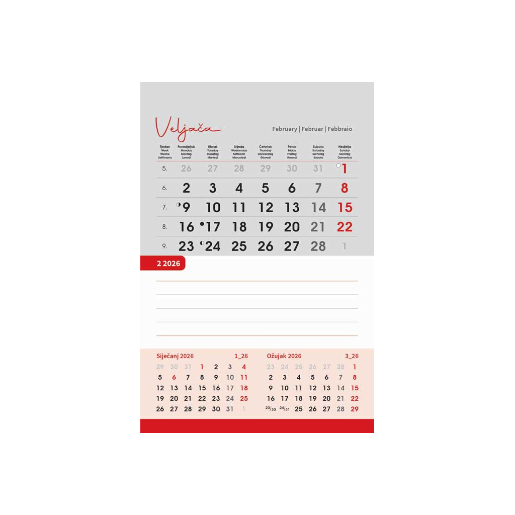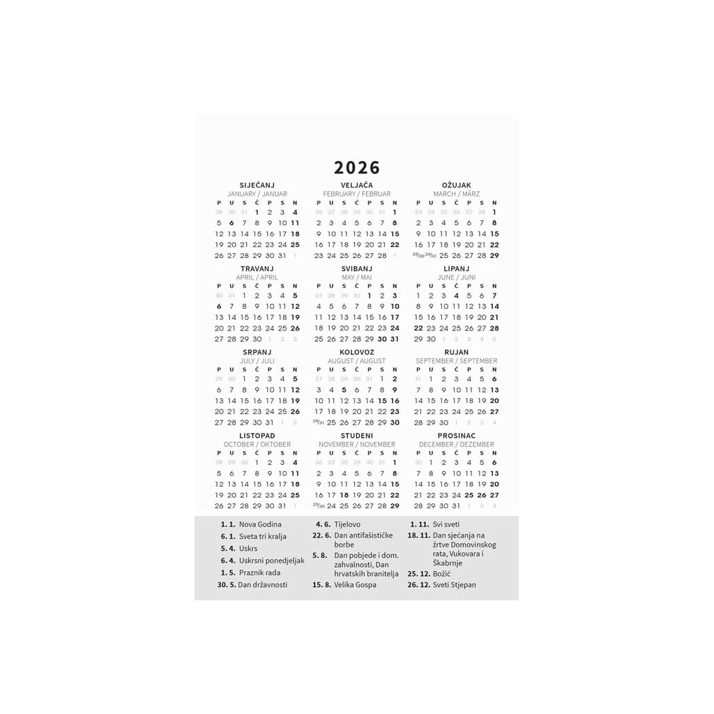 opseg: 13 listovandimenzija: 10 x 19 cmnprostor za dotisak: 10 x 4 cmnopis: tromjesečni kalendarij, kovertanjezici: HR. GB, ITntisak: obostrani 4/4, na poleđini svakog lista se nalazi kalendar za cijelu godinunvrsta papira: 90 g/m2 listovi, HIGH POINT 295 g /m2 podloga nuvez: spiralninpakiranje: 1 kom