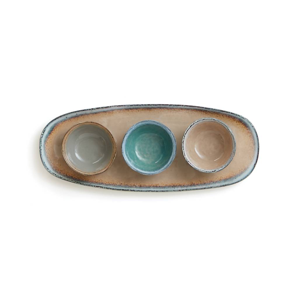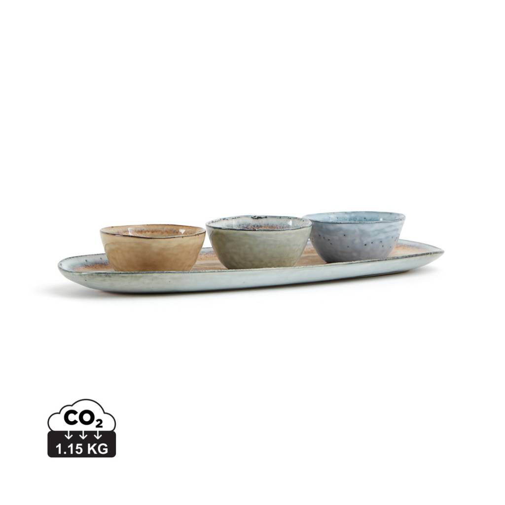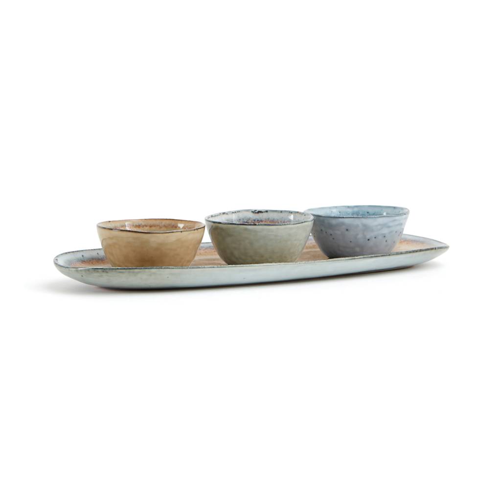 Stoneware serving dish with three small bowls. Unlimited possibilities: Tapas, dips or snacks. The serving dish alone is great for serving salads or canapés. Nomimono draws its inspiration from nature and the earth around us, creating this rustic range in natural earth tones where no two items are the same. Japanese meets Scandinavian, rustic meets modern. Collectibles for a down-to-earth and inspiring serving. Each item is handmade and unique. Every item is glazed three times to obtain the right kind of finish. Dishwasher and microwave safe.