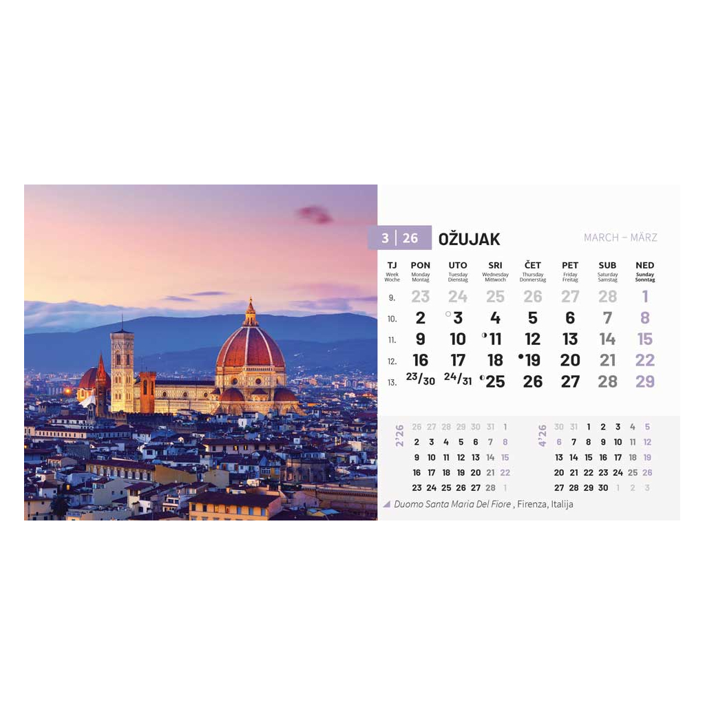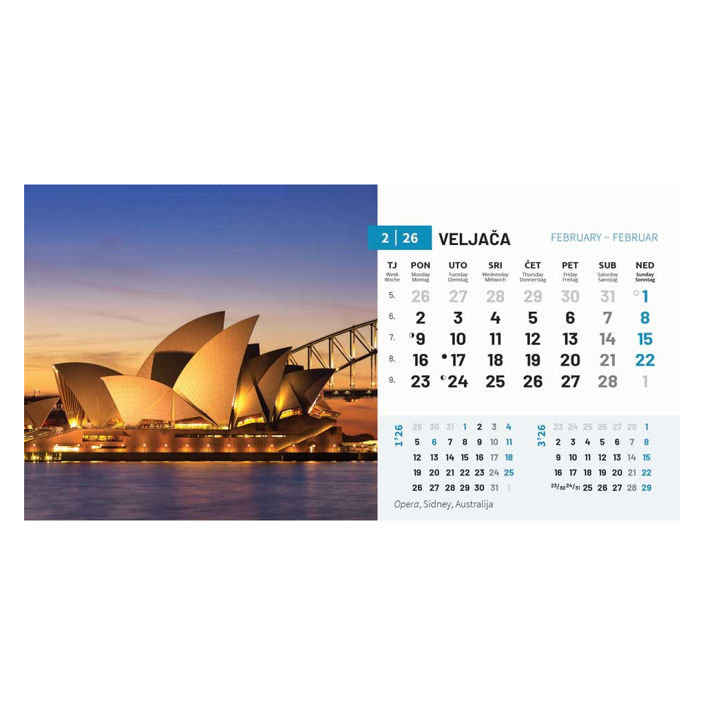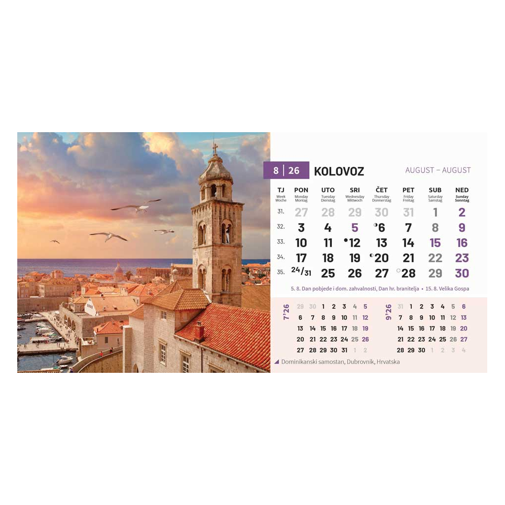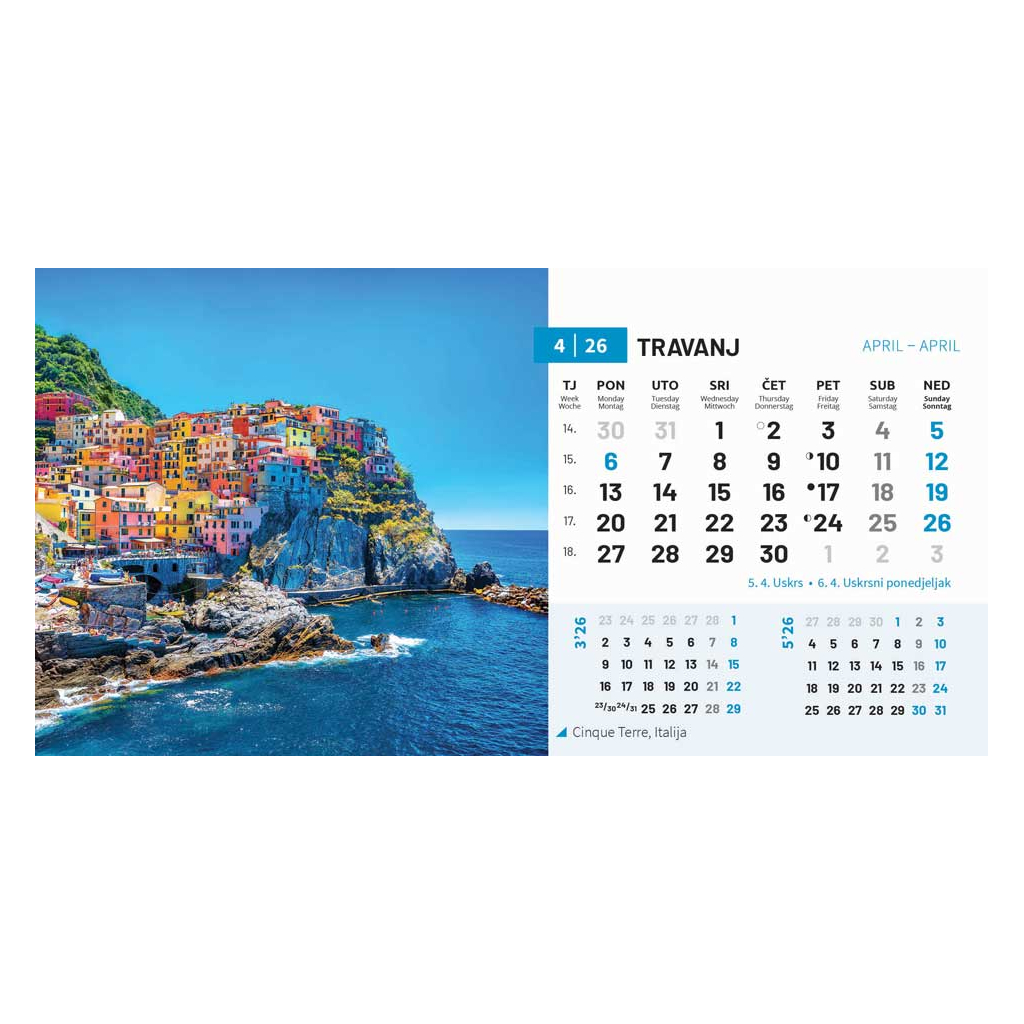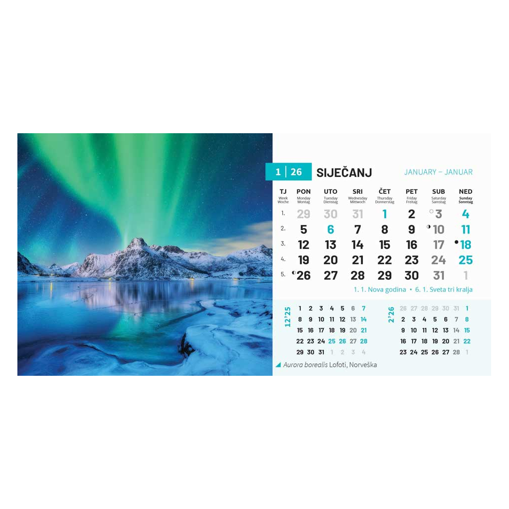 opseg: 13 listovandimenzija: 20,5 x 14,5 cmnprostor za dotisak: 20 x 4 cmnopis: tromjesečni kalendarij, kovertantisak: obostrani 4/4, na poleđini svakog lista se nalazi kalendar za cijelu godinunjezici: HR. GB, DEnvrsta papira: KD 135 g/m2 listovi, HIGH POINT 295 g /m2 podloga nuvez: spiralninpakiranje: 1 kom