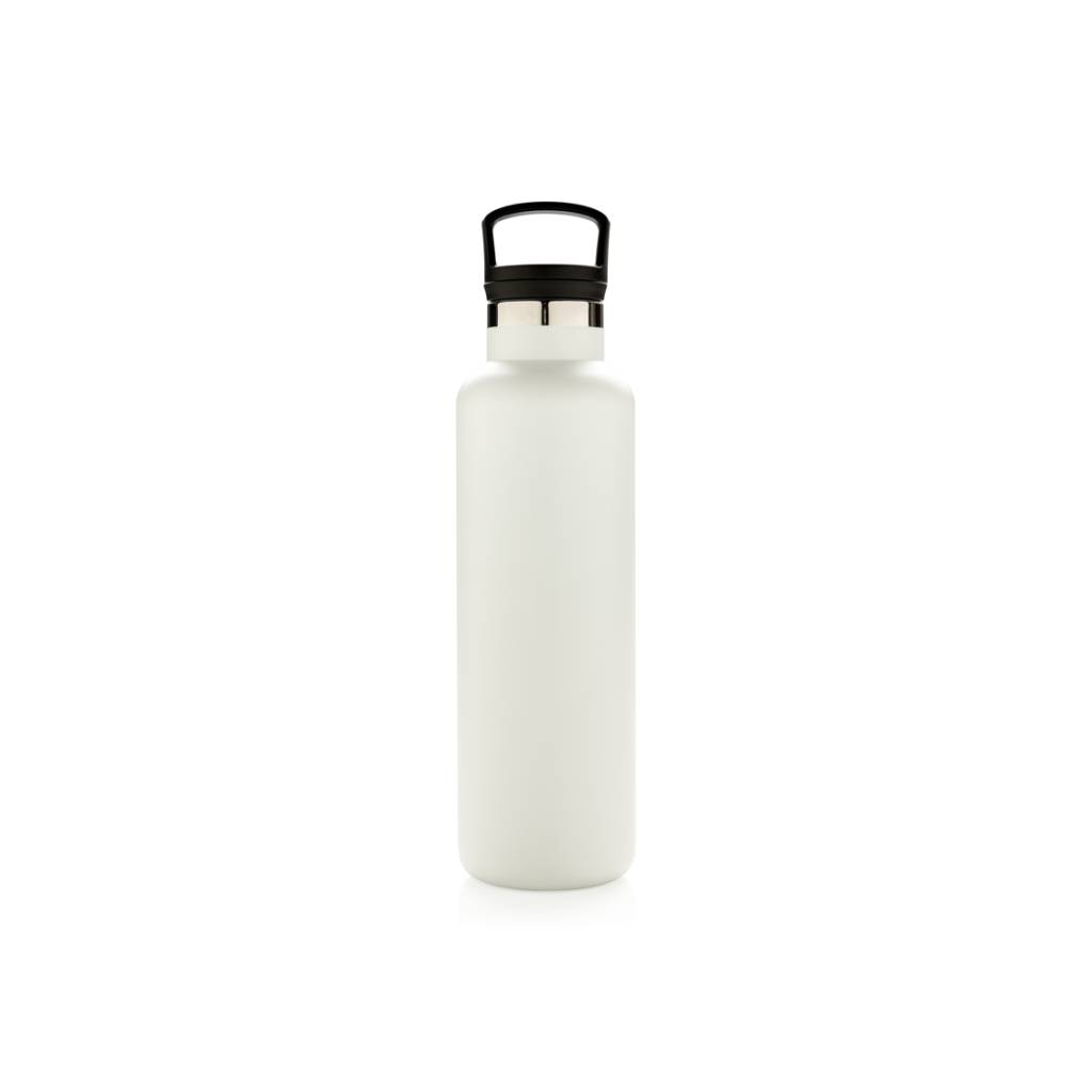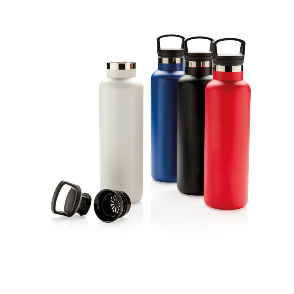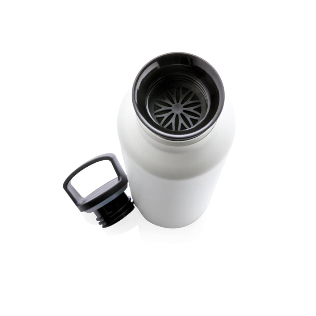 Vakuumski izolirana boca s dvostrukim stijenkama premazana prahom. Poklopac 2-u-1 s filtrom, savršen za vrući čaj ili natopljenu vodu. Standardni otvor za usta, idealan za ispijanje i dodavanje kockica leda. Napravljena da traje, izvrsna boca za svako godišnje doba. 304 SS unutarnji i 201 SS vanjski održavaju vaša pića vrućima do 5 sati i hladnima do 15 sati. Sadržaj: 600ml.